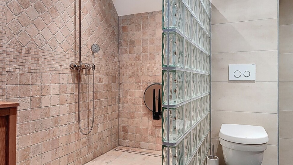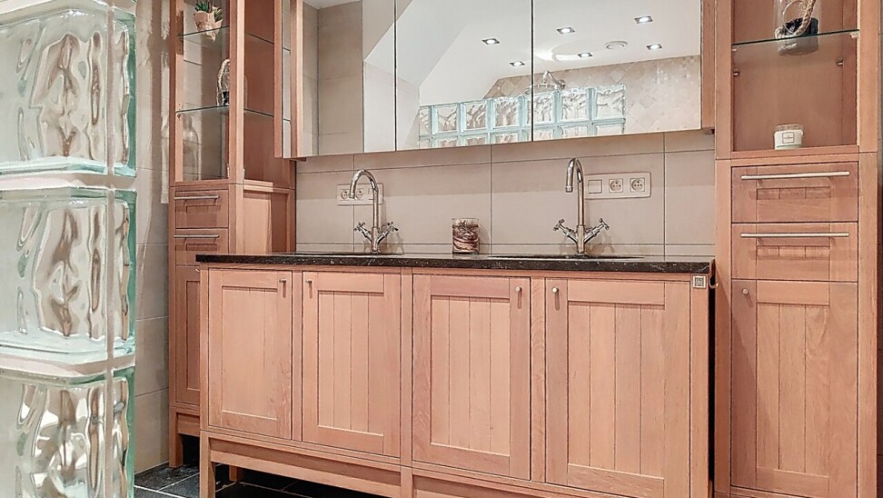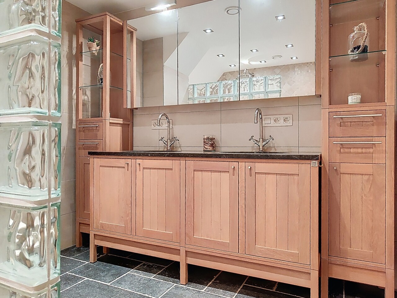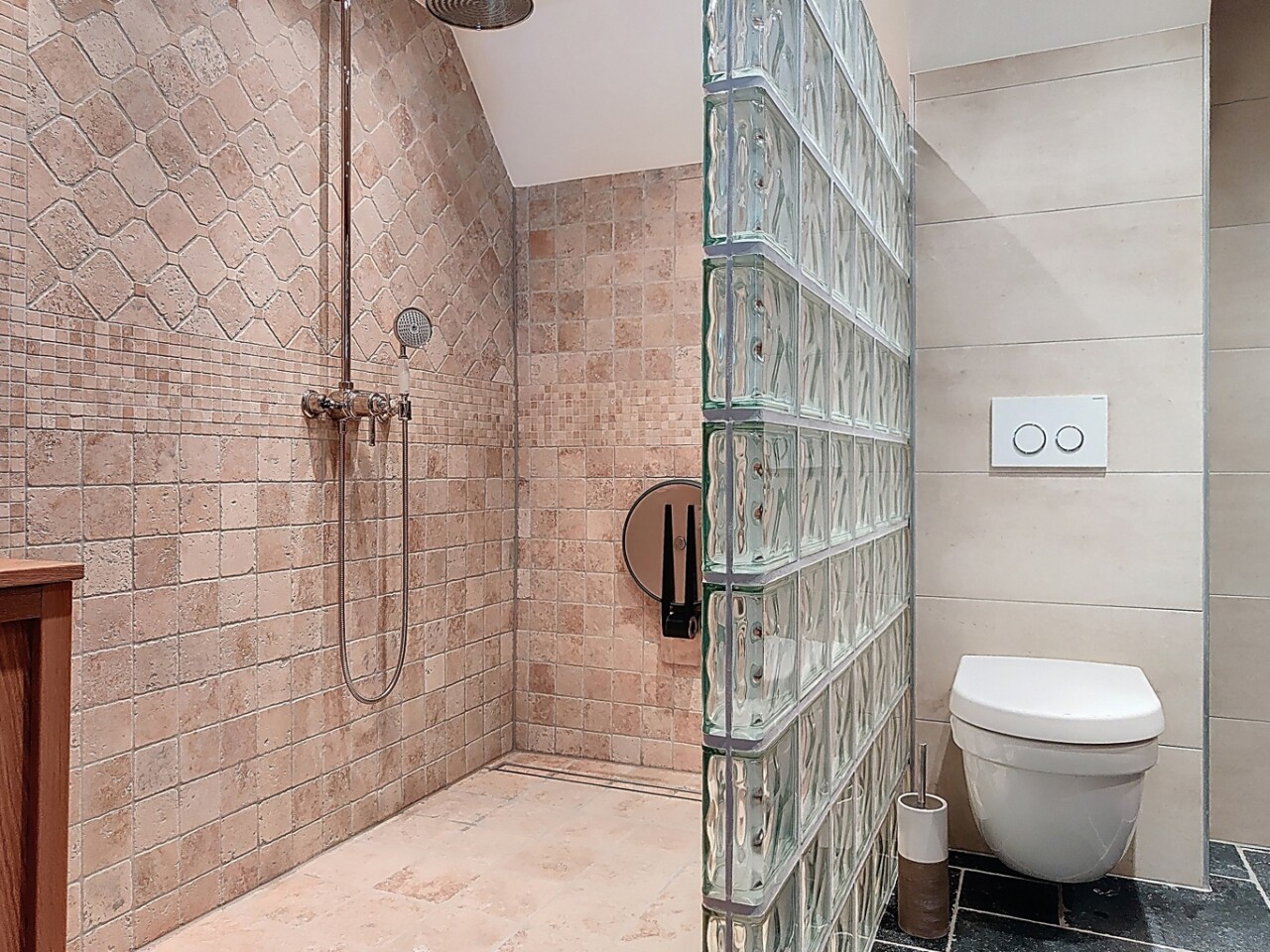 Luxe badkamer met inloopdouche, dubbele lavabo en toilet